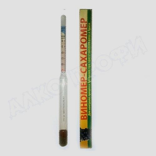 Бытовой виномер, он же сахаромер, он же брагомер из семейства ареометров, предназначен для определения содержания сахара в фруктовом соке или сахарной смеси. Диапазон измерений 0-25% сахара, 0-12% оборотов спирта. Снятие показаний производить по верхнему краю мениска при температуре раствора 20с±2°С.